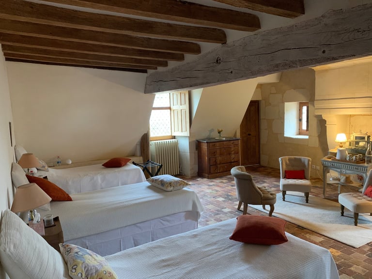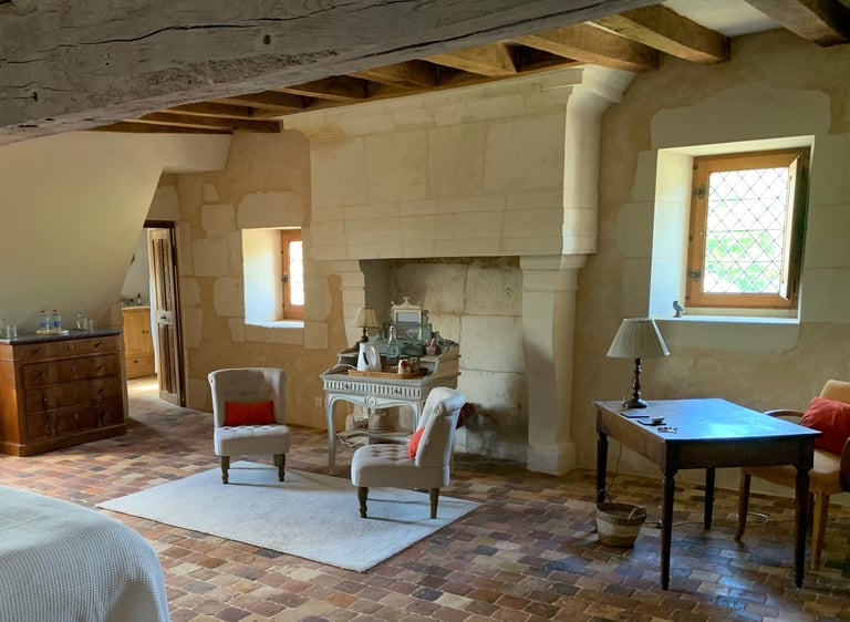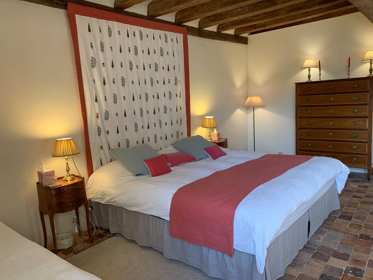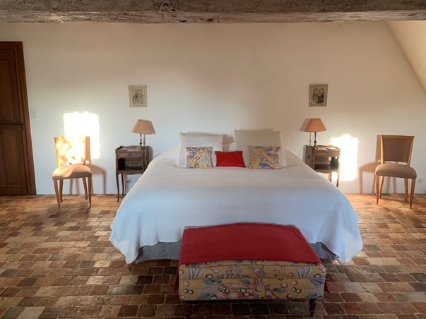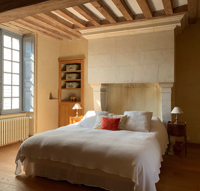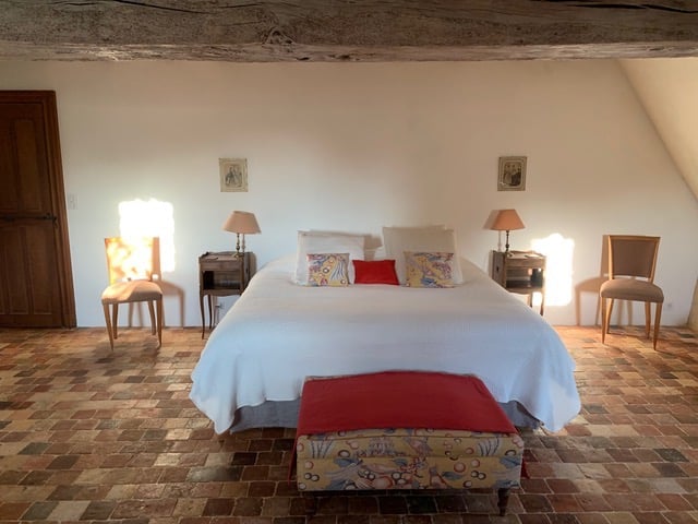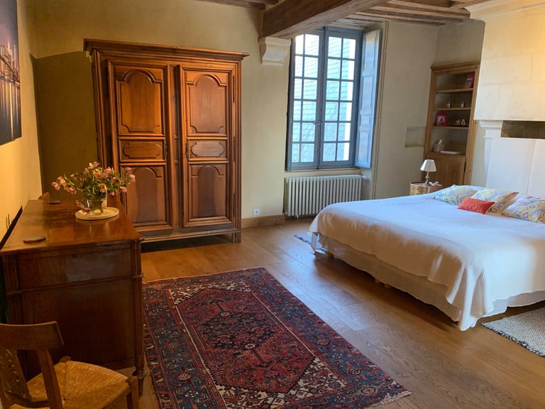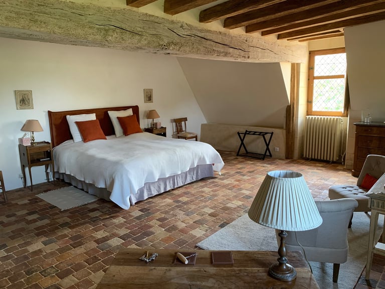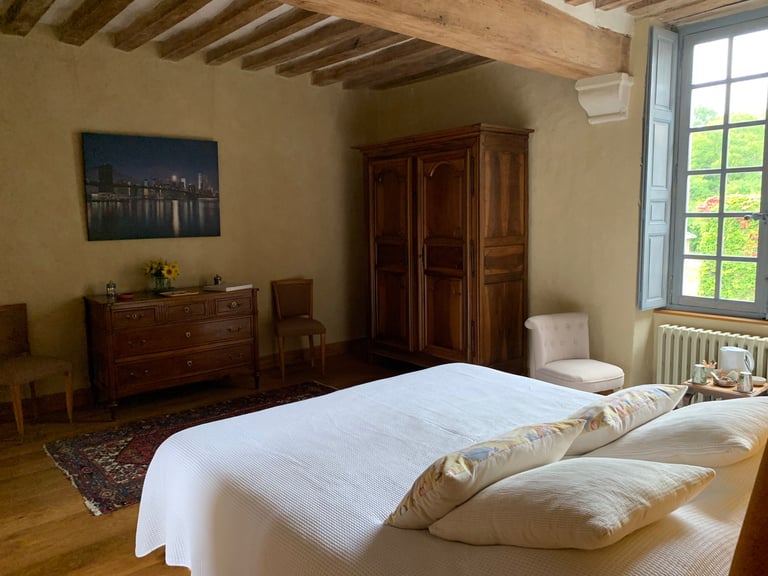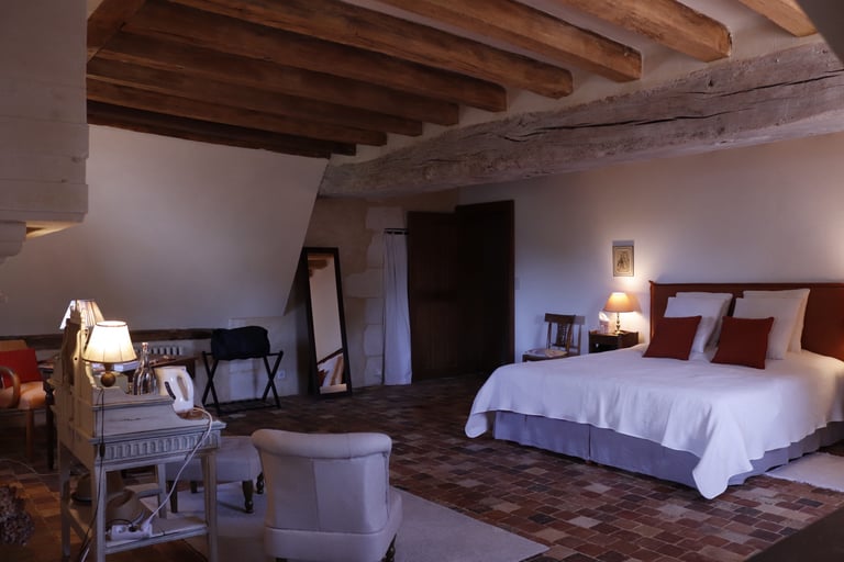 La chambre seigneuriale spacieuse et lumineuse, avec un lit king size (ou 2 lits jumeaux), offre une excellente literie en fibres naturelles, fabriquée sur mesure par la Maison Cosme.