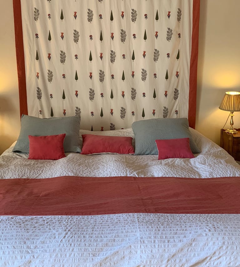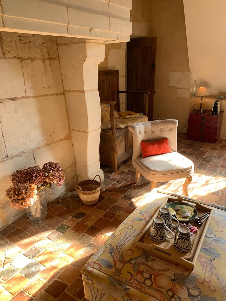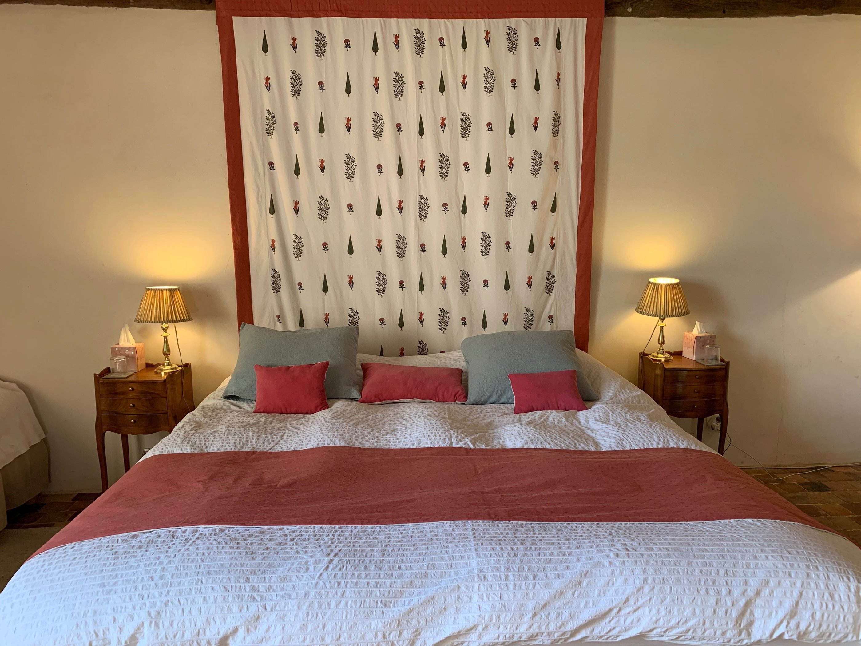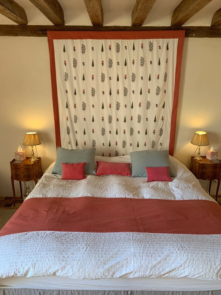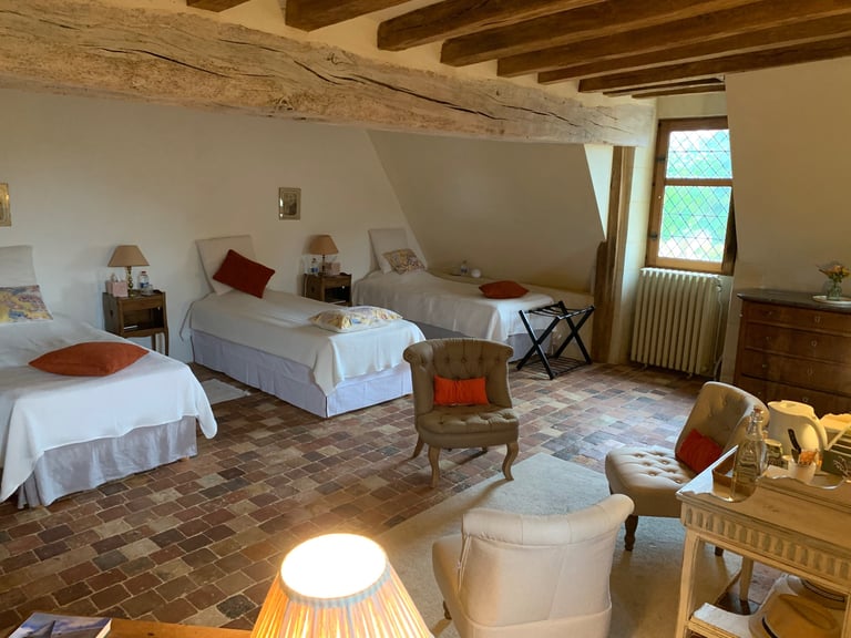 La chambre seigneuriale spacieuse et lumineuse, avec un lit king size (ou 2 lits jumeaux), offre une excellente literie en fibres naturelles, fabriquée sur mesure par la Maison Cosme.